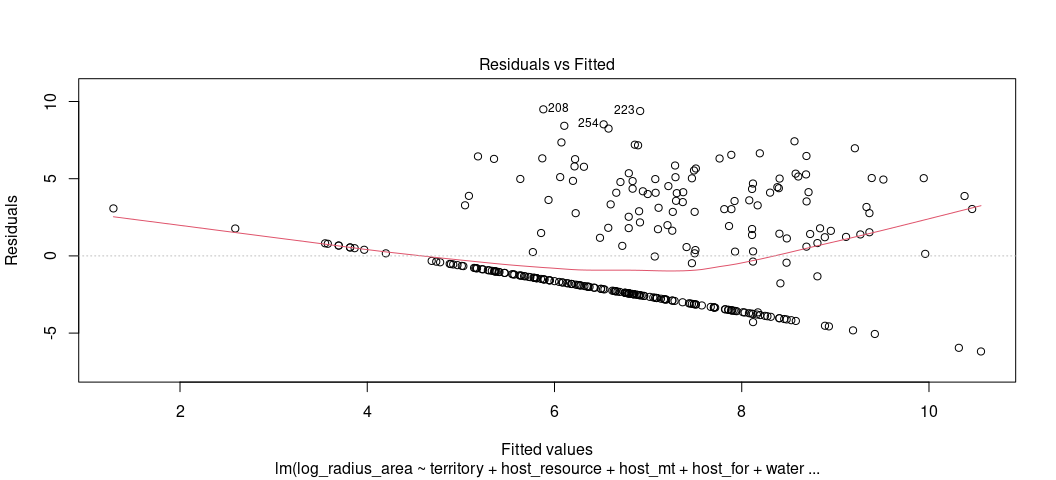 When you see something like this, it’s suggesting you have some kind of “hurdle” component to the data-generating process. There is a separate process that determines that big bar you see and then a separate one determining the variation in the flatter distribution to the right of it. Braithwaite’s third footnote is pointing to his 2005 data article in International Interactions that might provide more context for why this value of 4.363605 occurs so much in his data. My best guess, absent knowing more about this particular article and the data, is there is a kind of default circle (with a default radius) that Braithwaite draws for any particular incident. If there is only one incident (for example, as there routinely is in CoW-MID data), then there is just the singular circle, no incident for which there is an expanded circle, and this value will just repeat. It seems to suggest a kind of data-generating process in which there are confrontations/disputes that have more than one incident (or not). Contingent on having more than one incident, there is a spread that’s now possible. Basically: there is a mixture of two data-generating processes resulting in the line you see and, contingent on not being on the line, some kind of spread. I do not at all expect you to know exactly what to do under these circumstances. I myself am only guessing that’s what is happening here. That said, here’s about what I’d expect you to say: “the fitted-residual plot suggests a clear discrete pattern in the DV and the histogram suggests two separate data-generating processes. Both strongly imply the linear model is a questionable fit for the data.”
